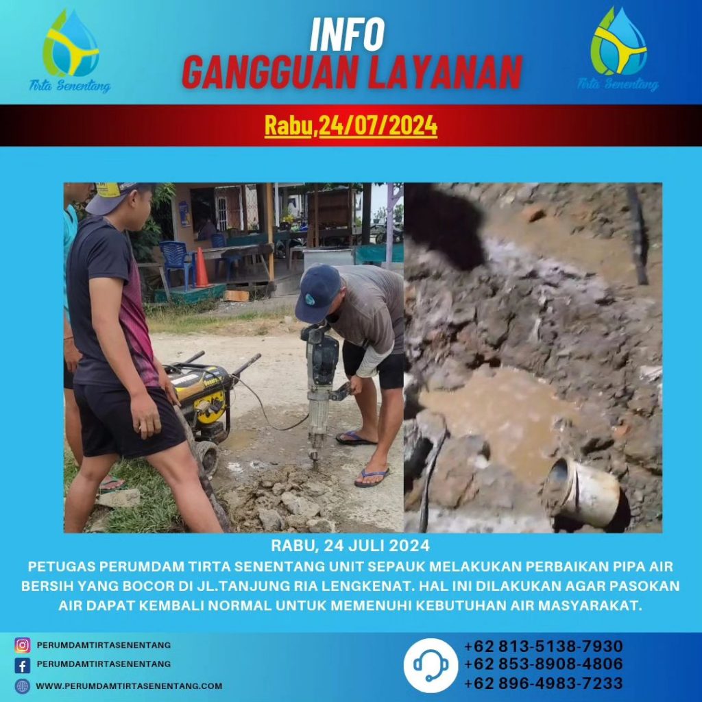 Distribusi Air Perumdam Tirta Senentang Unit Sungai Ringin Tidak Dapat Dilakukan Karena Ada Kebocoran Pipa Jul 30, 2024