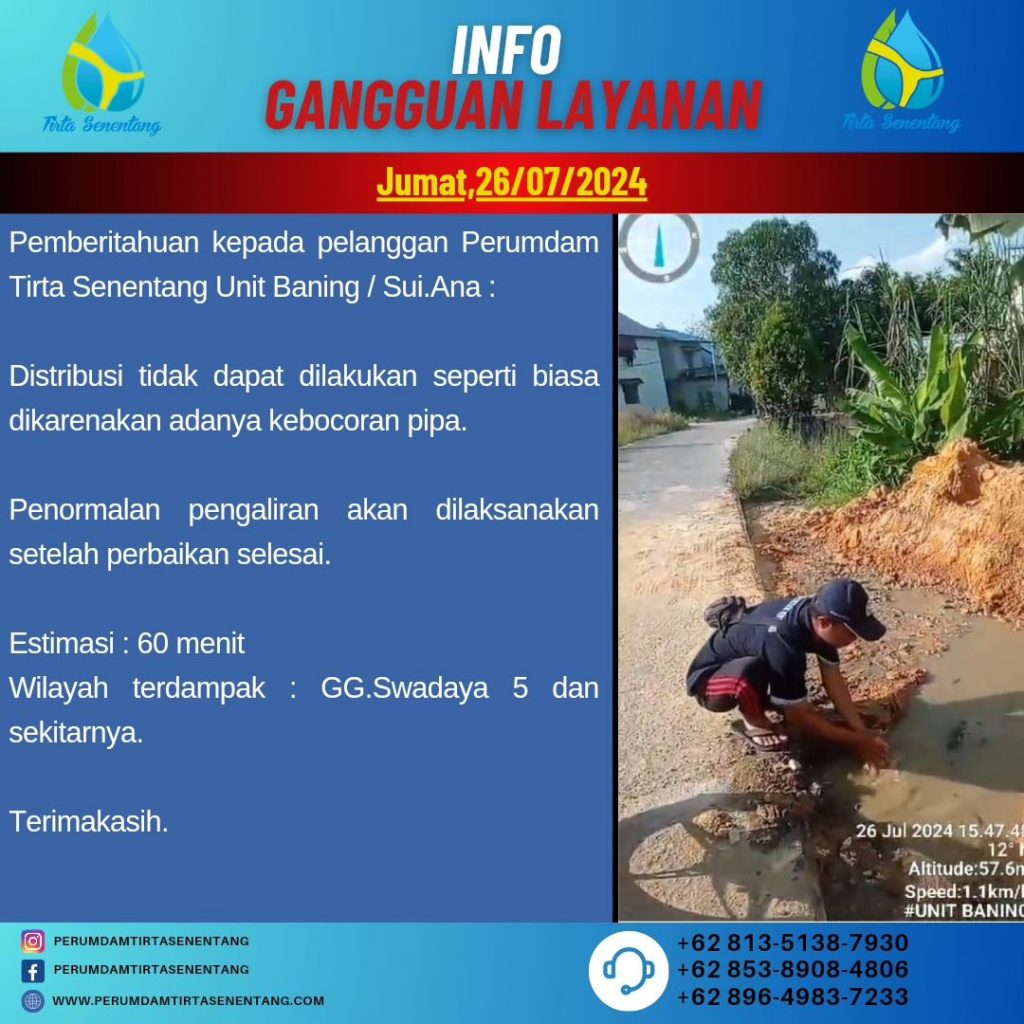 Distribusi Air Perumdam Tirta Senentang Unit Baning/Sui.Ana Tidak Dapat Dilakukan Karena Ada Kebocoran Pipa Jul 26, 2024