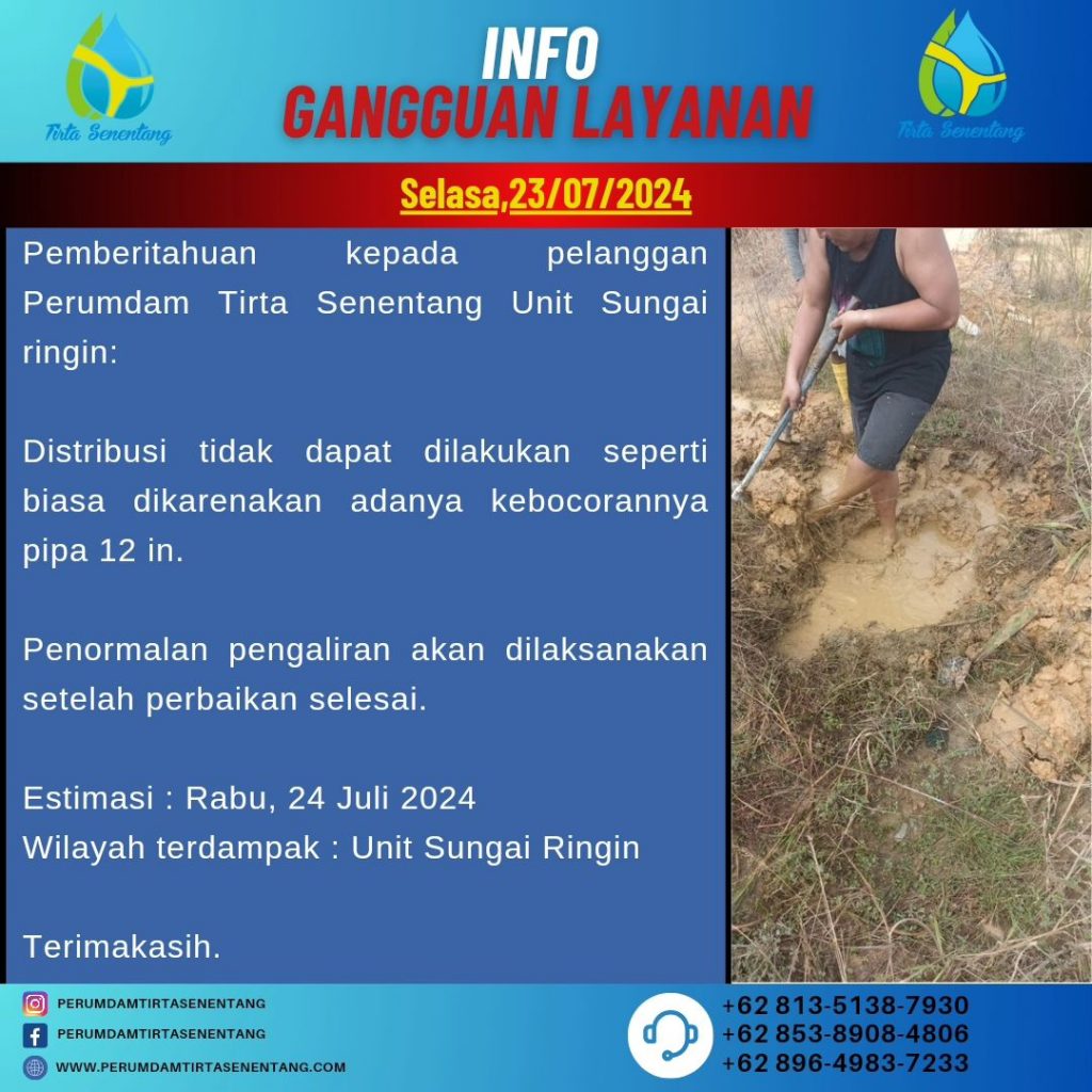 Distribusi Air Perumdam Tirta Senentang Unit Sungai Ringin Tidak Dapat Dilakukan Karena Perbaikan Pipa 12 in Jul 23, 2024