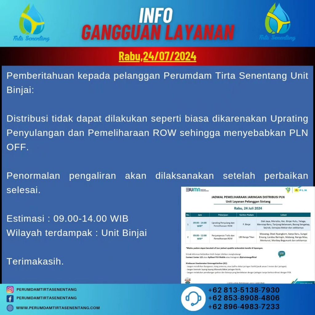 Distribusi Air Perumdam Tirta Senentang Unit Binjai Tidak Dapat Dilakukan Karena Uprating Penyulangan dan Pemeliharaan ROW sehingga menyebabkan PLN OFF Jul 24, 2024