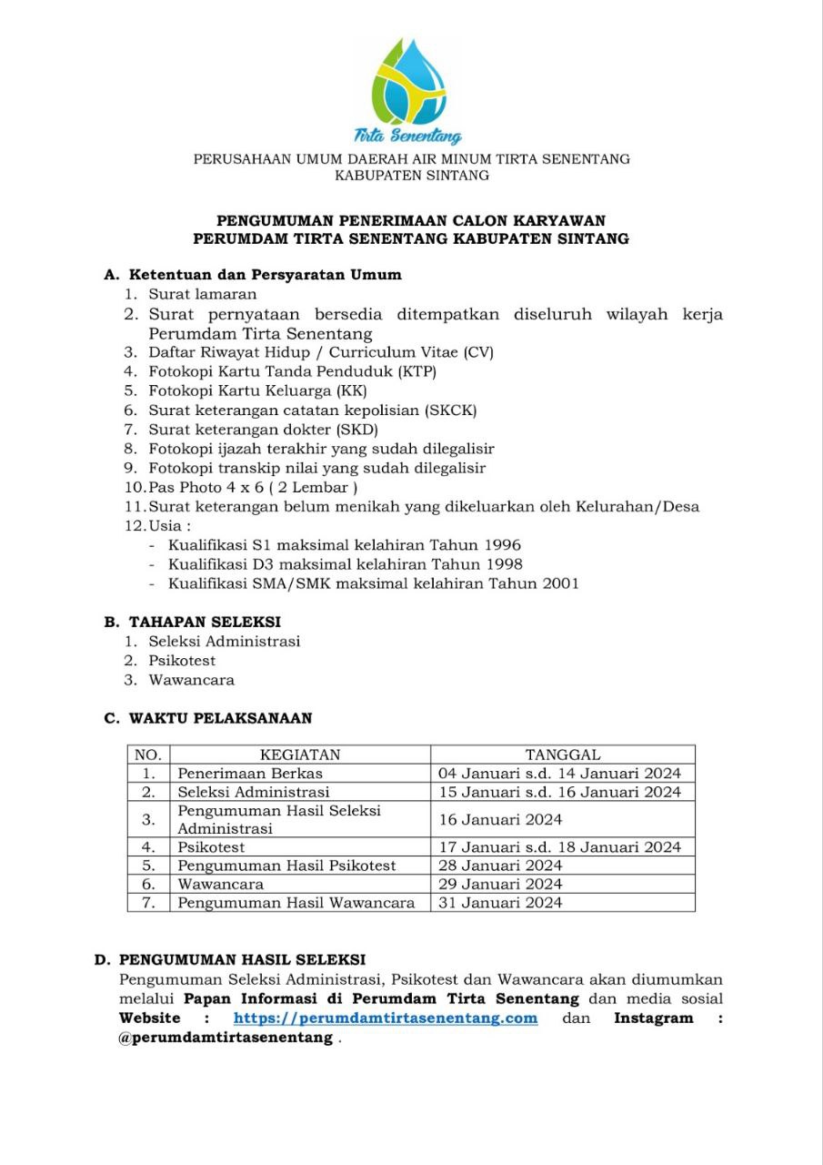 Hasil Seleksi Administrasi Penerimaan Calon Karyawan Perumdam Tirta Senentang Kabupaten Sintang 2024 Jan 15, 2024