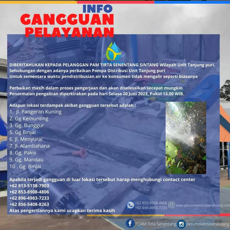 Perbaikan pipa pada unit Tempunak, Sungai Ringin, dan Sungai Ana/Baning telah selesai, distribusi air sudah dilakukan kembali