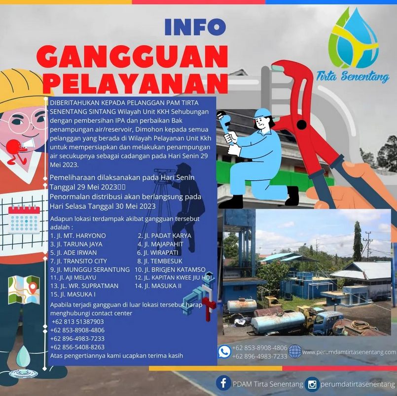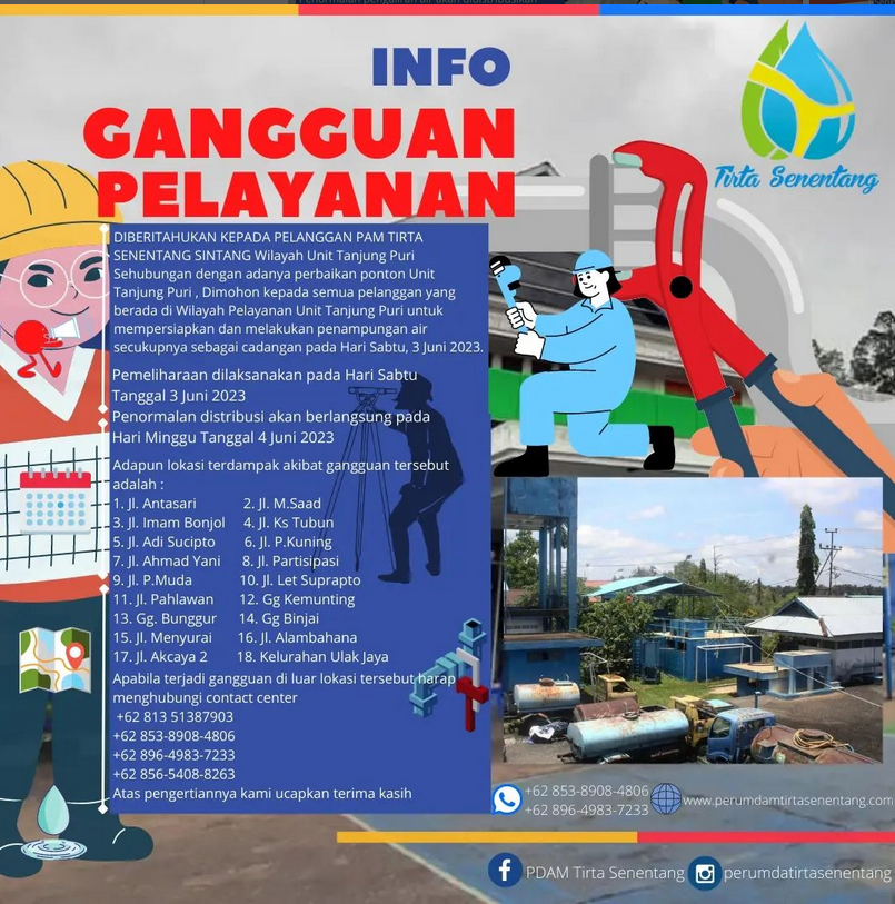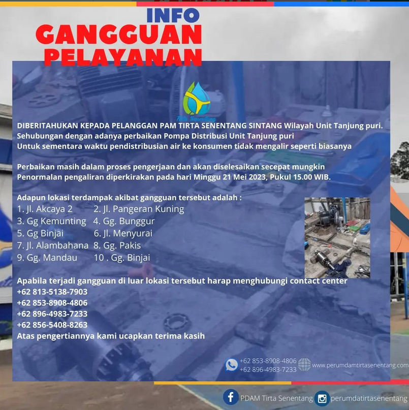 DIBERITAHUKAN KEPADA PELANGGAN PAM TIRTA SENENTANG SINTANG Wilayah Unit Tanjung puri. Sehubungan dengan adanya perbaikan Pompa Distribusi Unit Tanjung puri