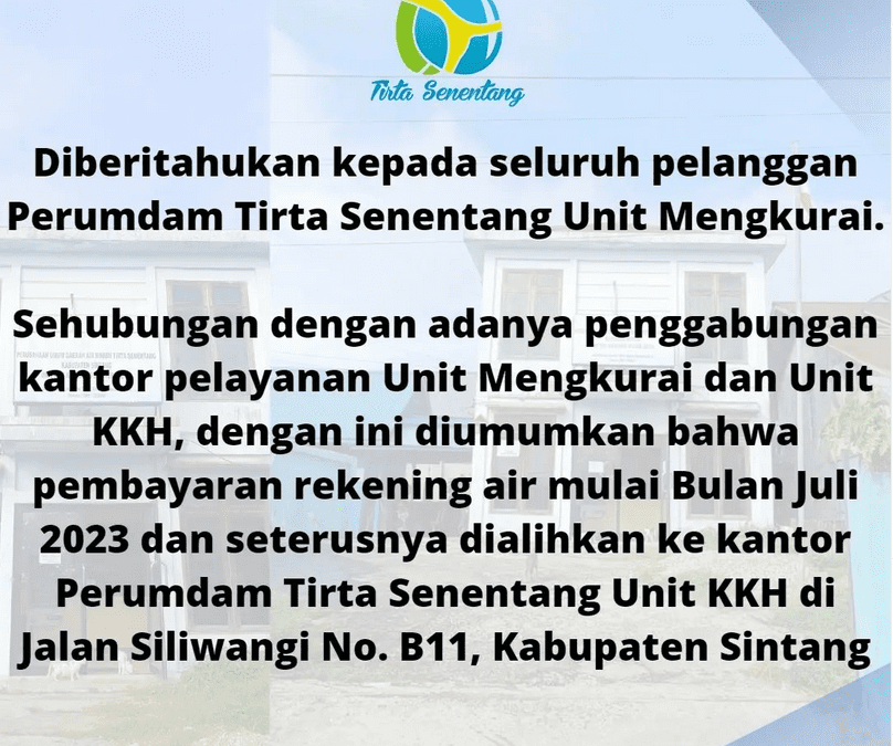 Pembayaran rekening air mulai Bulan Juli 2023 dan seterusnya dialihkan ke kantor Perumdam Tirta Senentang Unit KKH Jul 4, 2023