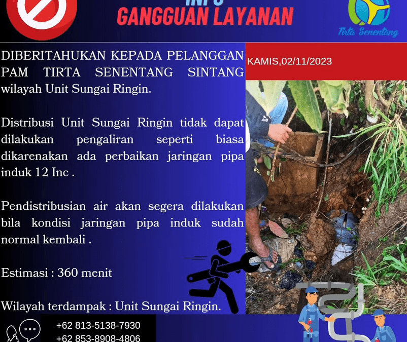 Perbaikan pipa pada unit Tempunak, Sungai Ringin, dan Sungai Ana/Baning telah selesai, distribusi air sudah dilakukan kembali